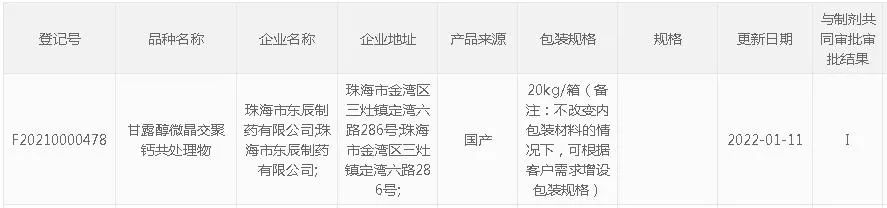 東辰制藥又一共處理輔料登記號(hào)在CDE公示了。此輔料名為T(mén)opfiller-OD?甘露醇微晶交聚鈣共處理物,型號(hào)TMF965,登記號(hào)F20210000478。