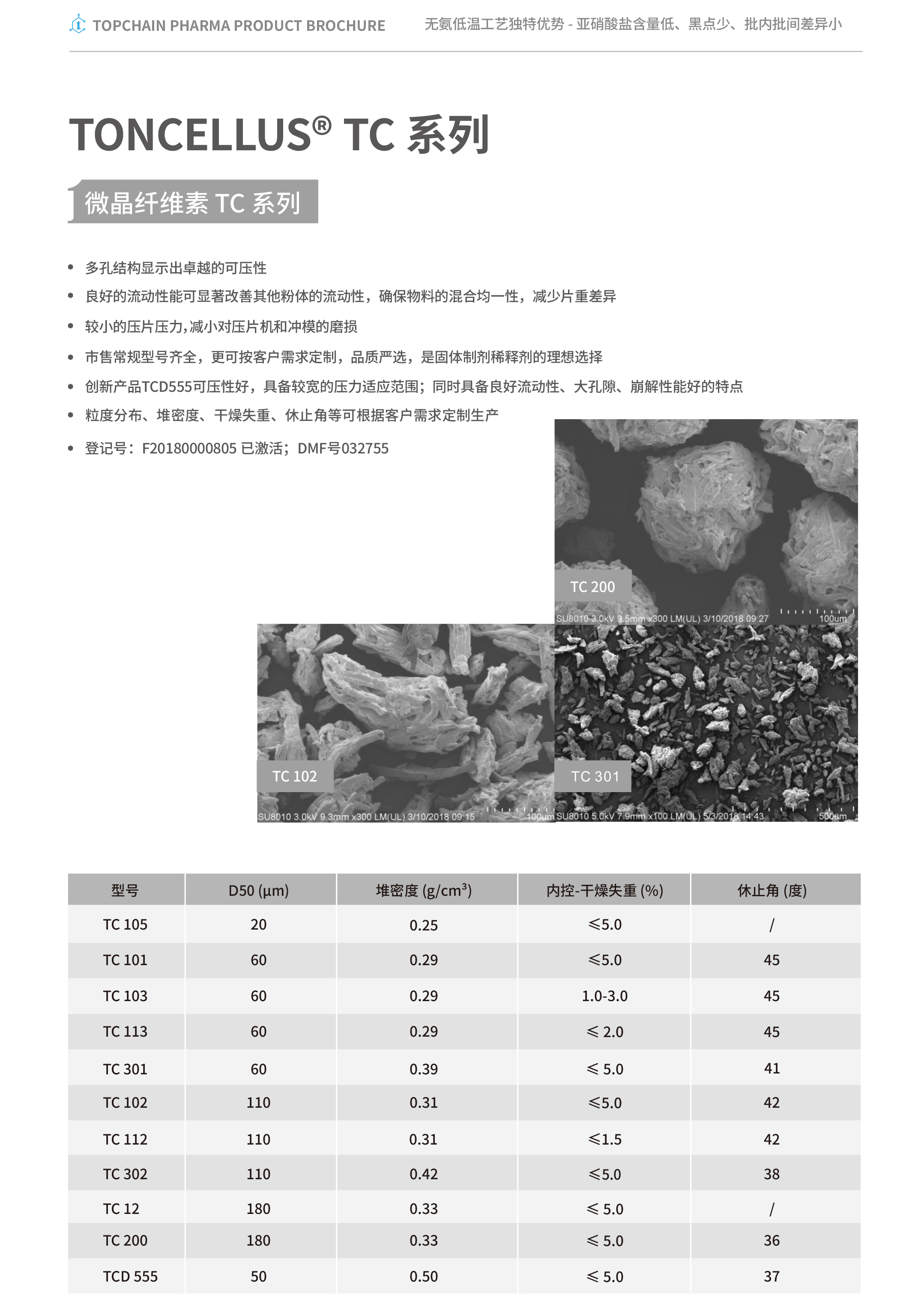 型號(hào) D50(μm) 堆密度 (g/cm3) 內(nèi)控-干燥失重 (%) 休止角 ° 登記號(hào) 功能特性 應(yīng)用 TONCELLUS? TC105 20 0.25 ≤5.0 / F20180000805已激活 可壓性?xún)?yōu)異;粘合性能優(yōu)異;干法制粒 極細(xì)粒徑規(guī)格,可壓性好、易壓片,也是強(qiáng)有力的干黏合劑 TONCELLUS? TC101 60 0.29 ≤5.0 45 F20180000805已激活 濕法制粒 常規(guī)型號(hào),顆粒較細(xì),可壓性好,用于濕法制粒 TONCELLUS? TC103 60 0.29 1.0-3.0 45 F20180000805已激活 濕法制粒 降低TC101的水分,可壓性好,適合對(duì)水分敏感API TONCELLUS? TC113 60 0.29 ≤2.0 45 F20180000805已激活 濕法制粒 粒徑與TC101相似,水分更低,可壓性好,適合對(duì)水分敏感API TONCELLUS? TC301 60 0.39 ≤5.0 41 F20180000805已激活 流動(dòng)性?xún)?yōu)異;崩解或膨脹性能好;直接壓片 增加TC101堆密度所得的型號(hào),流動(dòng)性和崩解性能大幅提升 TONCELLUS? TC102 110 0.31 ≤5.0 42 F20180000805已激活 流動(dòng)性?xún)?yōu)異;直接壓片 TC10改善型,流動(dòng)性、可壓性好,用于直壓 TONCELLUS? TC112 110 0.31 ≤5.0 42 F20180000805已激活 流動(dòng)性?xún)?yōu)異;直接壓片;低水分產(chǎn)品 在TC102基礎(chǔ)上降低水分含量,適合對(duì)水敏感的API TONCELLUS? TC302 110 0.42 ≤5.0 38 F20180000805已激活 流動(dòng)性?xún)?yōu)異;崩解或膨脹性能好;直接壓片 增加TC102堆密度所得的型號(hào),改善流動(dòng)和崩解性,適合高速壓片 TONCELLUS? TC12 180 0.33 ≤1.5 / F20180000805已激活 可壓性?xún)?yōu)異;流動(dòng)性?xún)?yōu)異;直接壓片 粗粒徑微晶纖維素,可壓性和流動(dòng)性?xún)?yōu)異 TONCELLUS? TC200 180 0.33 ≤5.0 36 F20180000805已激活 流動(dòng)性?xún)?yōu)異;直接壓片 在TC102基礎(chǔ)上繼續(xù)增大粒徑尺寸,顆粒球形度高,富含孔隙,具有優(yōu)異的流動(dòng)性、可壓性,適用于直壓 TONCELLUS? TCD555 50 0.45 ≤5.0 37 F20180000805已激活 可壓性?xún)?yōu)異;崩解或膨脹性能好 創(chuàng)新型號(hào)。粒徑接近TC101,密度略高TC302,具有良好的崩解性 能、可提高片劑硬度,用于解決固體制劑崩解等問(wèn)題 -