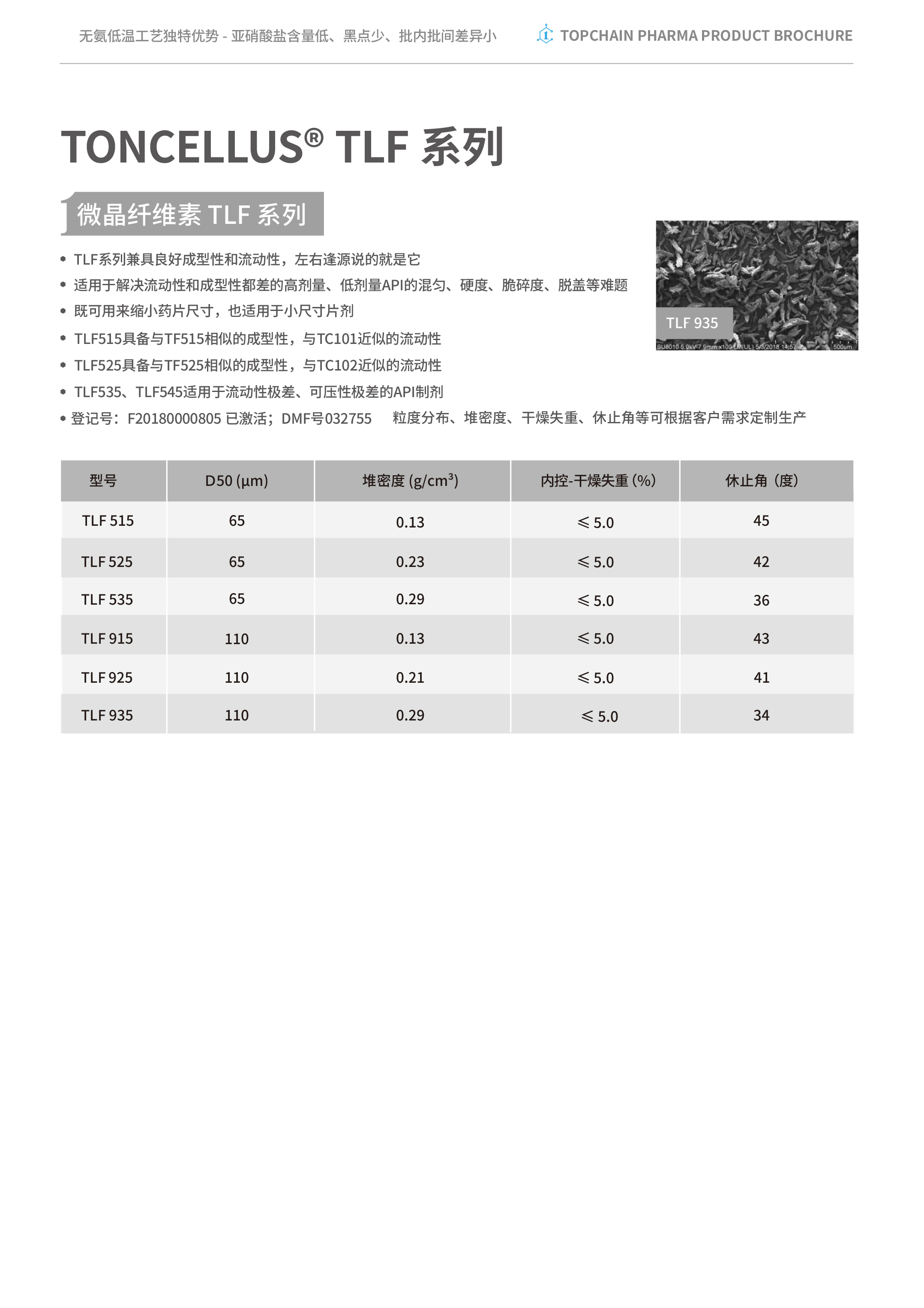 型號(hào) D50 (μm) 堆密度 (g/cm3) 內(nèi)控-干燥失重(%) 休止角 ° 登記號(hào) 功能特性 應(yīng)用 TONCELLUS? TLF515 65 0.13 ≤5.0 45 F20180000805已激活 可壓性?xún)?yōu)異; 創(chuàng)新型改性MCC。保持可壓性好的基礎(chǔ)上,流動(dòng)性有一定改善 TONCELLUS? TLF525 65 0.23 ≤5.0 42 F20180000805已激活 可壓性?xún)?yōu)異; 創(chuàng)新型改性MCC。兼具良好的流動(dòng)性和可壓性 TONCELLUS? TLF535 65 0.29 ≤5.0 36 F20180000805已激活 流動(dòng)性?xún)?yōu)異;可壓性?xún)?yōu)異;直接壓片 創(chuàng)新型改性MCC。是高可壓性和高流動(dòng)性?xún)?yōu)異結(jié)合的典型體現(xiàn) TONCELLUS? TLF915 110 0.13 ≤5.0 43 F20180000805已激活 流動(dòng)性?xún)?yōu)異;可壓性?xún)?yōu)異;直接壓片 創(chuàng)新型改性MCC,TLF515的改進(jìn)產(chǎn)品,通過(guò)增大粒徑提升粉體流動(dòng)性 TONCELLUS? TLF925 110 0.21 ≤5.0 41 F20180000805已激活 流動(dòng)性?xún)?yōu)異;可壓性?xún)?yōu)異;直接壓片 創(chuàng)新型改性MCC,TLF525的改進(jìn)產(chǎn)品,通過(guò)增大粒徑提升粉體流動(dòng)性 TONCELLUS? TLF935 110 0.29 ≤5.0 34 F20180000805已激活 流動(dòng)性?xún)?yōu)異;可壓性?xún)?yōu)異;直接壓片 創(chuàng)新型改性MCC,TLF535的改進(jìn)產(chǎn)品,通過(guò)增大粒徑提升粉體流動(dòng)性 -