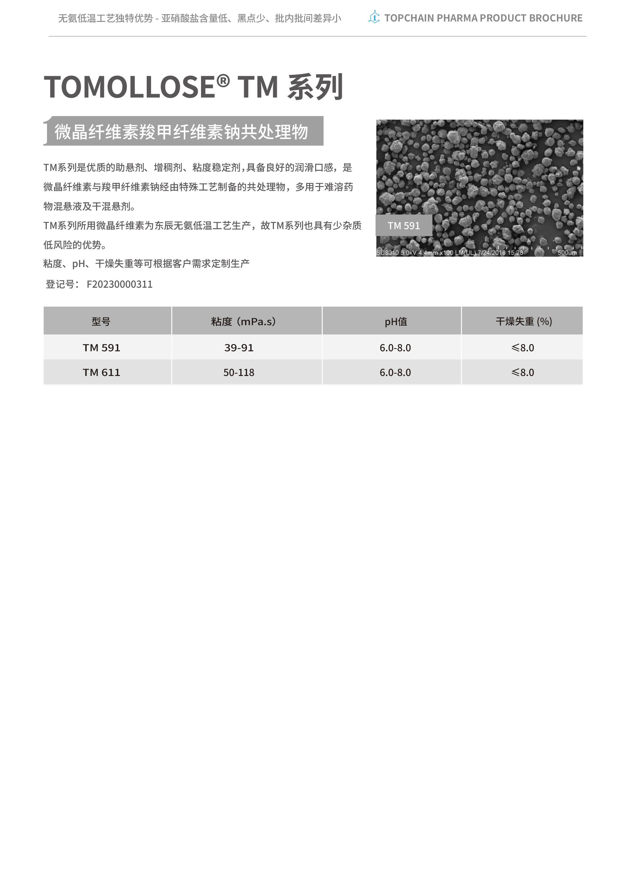型號(hào) 粘度( mpa·s) pH值 干燥失重(%) 功能特性 應(yīng)用 登記號(hào) TOMOLLOSE? TM591 39-91 6.0-8.0 ≤8.0 乳化助懸 助懸劑,潤(rùn)滑口感好,其水分散體具有觸變性,用于難溶藥物混懸液 F20230000311 TOMOLLOSE? TM611 50-118 6.0-8.0 ≤8.0 乳化助懸 優(yōu)質(zhì)助懸劑,良好潤(rùn)滑口感,多用于難溶藥物干混懸劑 F20230000311 -