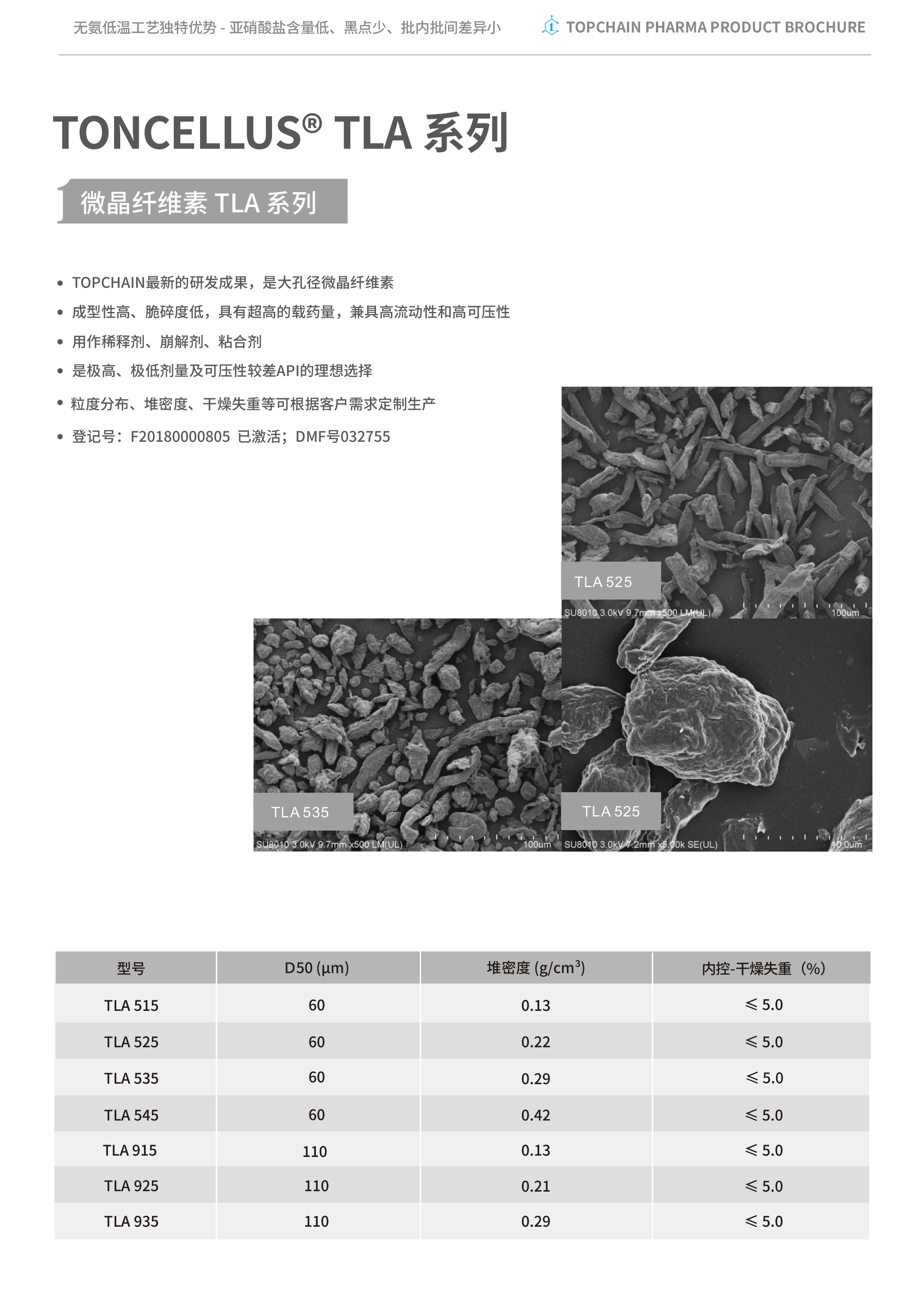 型號(hào) D50(μm) 堆密度(g/cm3) 內(nèi)控-干燥失重(%) 登記號(hào) 功能特性 應(yīng)用 TONCELLUS? TLA515 60 0.13 ≤5.0 F20180000805 已激活 可壓性?xún)?yōu)異;流動(dòng)性?xún)?yōu)異;崩解或膨脹性能好 直接壓片;創(chuàng)新型大孔徑MCC。富含孔隙,具有良好的可壓性和高載藥量;粒徑和堆密度與TF515類(lèi)似,可壓性?xún)?yōu)于TF515,特別適合液體API轉(zhuǎn)化為固體制劑的生產(chǎn) TONCELLUS? TLA525 60 0.22 ≤5.0 F20180000805 已激活 可壓性?xún)?yōu)異;流動(dòng)性?xún)?yōu)異;崩解或膨脹性能好 直接壓片;創(chuàng)新型大孔徑MCC。長(zhǎng)桿狀粒子,增大TLA515的堆密度,改善流動(dòng) 性,兼具高流動(dòng)性、高可壓性和高載藥量 TONCELLUS? TLA535 60 0.29 ≤5.0 F20180000805 已激活 可壓性?xún)?yōu)異;流動(dòng)性?xún)?yōu)異;崩解或膨脹性能好 直接壓片;創(chuàng)新型大孔徑MCC,TLA525的改進(jìn)型,類(lèi)球形顆粒增加,流動(dòng)性更好 TONCELLUS? TLA545 60 0.42 ≤5.0 F20180000805 已激活 可壓性?xún)?yōu)異;流動(dòng)性?xún)?yōu)異;崩解或膨脹性能好 直接壓片;創(chuàng)新型大孔徑MCC。TLA525基礎(chǔ)上大幅提高堆密度,極大的提高流動(dòng)性能,可壓性稍有降低 TONCELLUS? TLA915 110 0.13 ≤5.0 F20180000805 已激活 可壓性?xún)?yōu)異;流動(dòng)性?xún)?yōu)異;崩解或膨脹性能好 直接壓片;創(chuàng)新型大孔徑MCC。增大TLA515的粒徑,流動(dòng)性能得到提升 TONCELLUS? TLA925 110 0.21 ≤5.0 F20180000805 已激活 可壓性?xún)?yōu)異;流動(dòng)性?xún)?yōu)異;崩解或膨脹性能好;直接壓片 直接壓片;創(chuàng)新型大孔徑MCC。增大TLA515的粒徑,流動(dòng)性能得到提升 TONCELLUS? TLA935 110 0.29 ≤5.0 F20180000805 已激活 可壓性?xún)?yōu)異;流動(dòng)性?xún)?yōu)異;崩解或膨脹性能好;直接壓片 直接壓片;創(chuàng)新型大孔徑MCC。增大TLA515的粒徑,流動(dòng)性能得到提升 -
