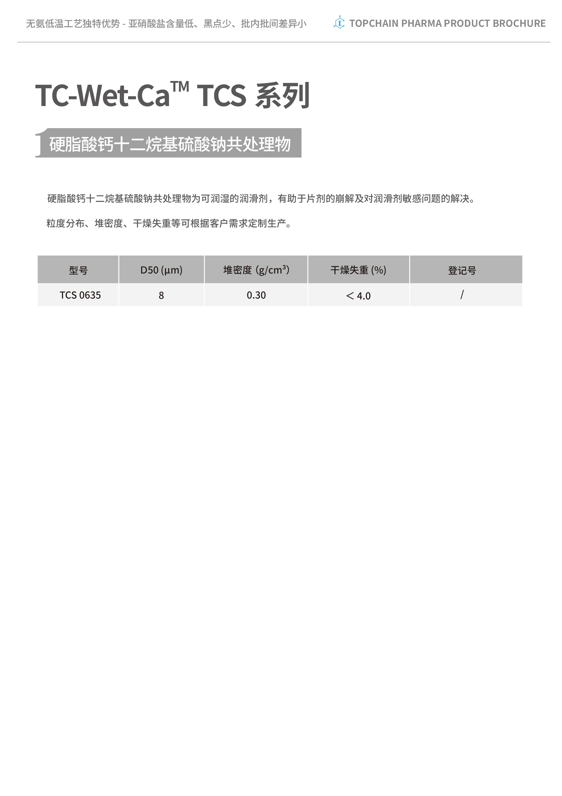 型號 D50(μm) 堆密度(g/cm3) 干燥失重(%) 登記號 功能特性 應用 TC-WET-Ca? TCS 0635 8 0.30 <4.0 F20240000720 潤滑劑 本品為可潤濕的潤滑劑,有助于降低潤滑劑對片劑崩解的負面影響,解決潤滑劑敏感問題 -