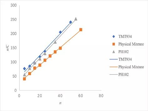 圖2. TMT934,PH102及物理混合物的川北方程