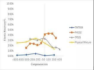 § 結(jié)果分析:試驗(yàn)樣品的壓縮成型性排序?yàn)?TMT934>物理混合物>TF525>PH102。