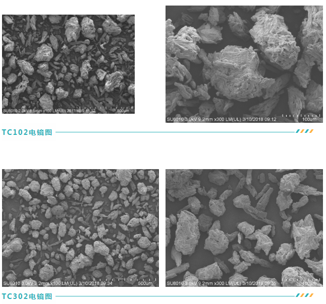 從電鏡圖可以看出,TC102的大小粒子形態(tài)差異較大,既有類球形的大顆粒,也有較多長(zhǎng)桿狀的小顆粒。而TC302的顆粒,無論從形態(tài)還是從大小來說都較為接近,不像TC102那么差異顯著。這讓TC302比TC102表現(xiàn)出了更好的流動(dòng)性能。