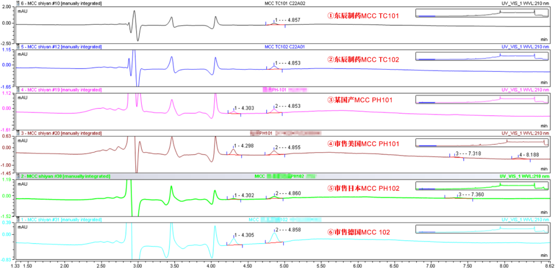 其中:①東辰制藥MCC TC101;②東辰制藥MCC TC102;③市售某國產(chǎn)MCC PH101;④市售美國MCC PH101;⑤市售日本MCC PH102;⑥市售德國MCC 102