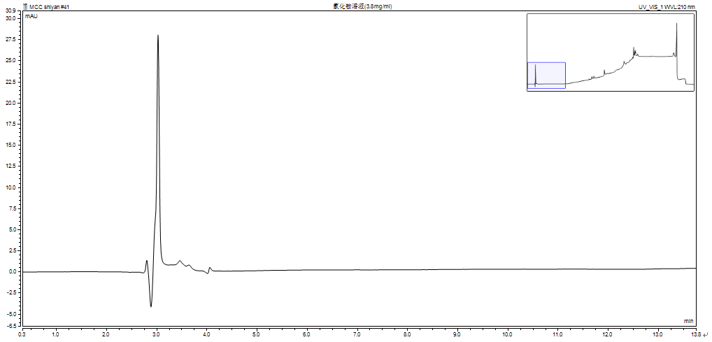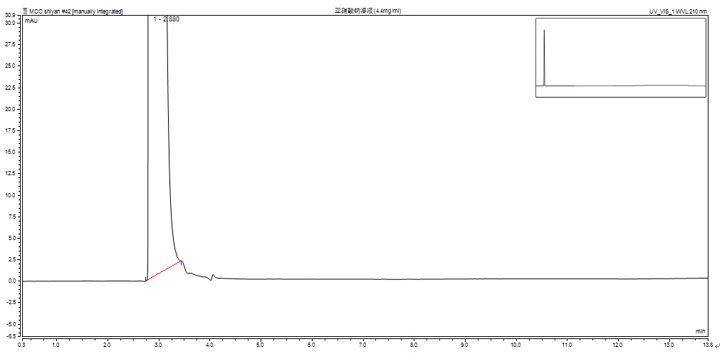 通過查閱文獻進行對比,我們發(fā)現(xiàn)甲醛、亞硝酸鈉在相同色譜條件下的吸收峰也出現(xiàn)在此區(qū)間(2.5~3.0min)。同時我們猜測MCC中是否含有氯化銨,并同樣影響了此峰形。