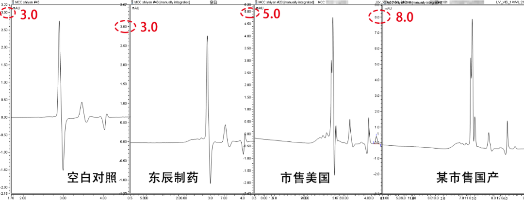 通過觀察檢測結(jié)果峰高,發(fā)現(xiàn)東辰制藥微晶纖維素溶劑峰高沒有變化,而國產(chǎn)另一家,峰高是溶劑峰的約3倍。進口微晶纖維素溶劑峰增加了約1倍。
